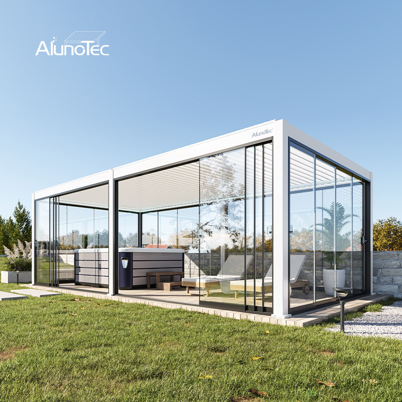A: No. When the louvers close, they form a waterproof roof; rain is routed through the integrated gutter and hidden downspouts inside the posts. Products are listed with an IP67 waterproof rating for the drive/electrics.