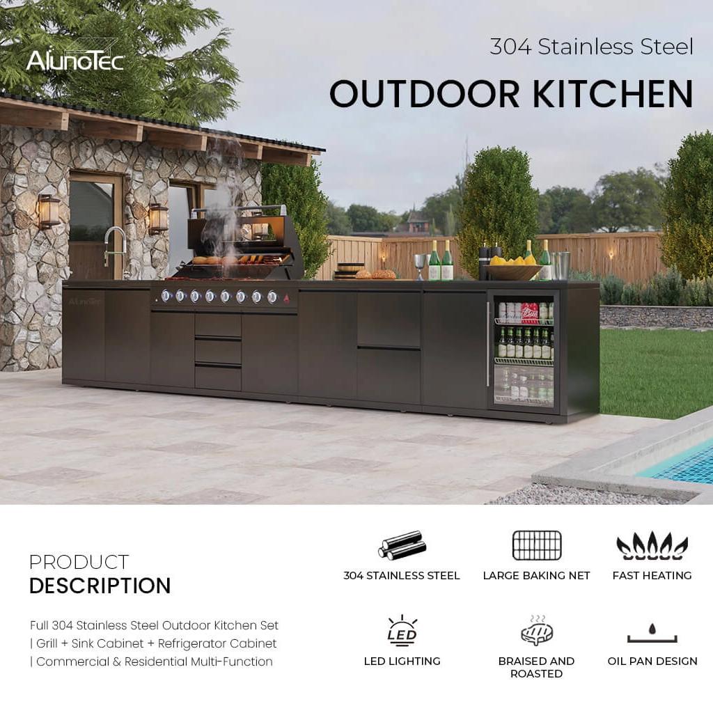 Full 304 Stainless Steel Outdoor Kitchen Set | Grill + Sink Cabinet + Refrigerator Cabinet | Commercial & Residential Multi-Function