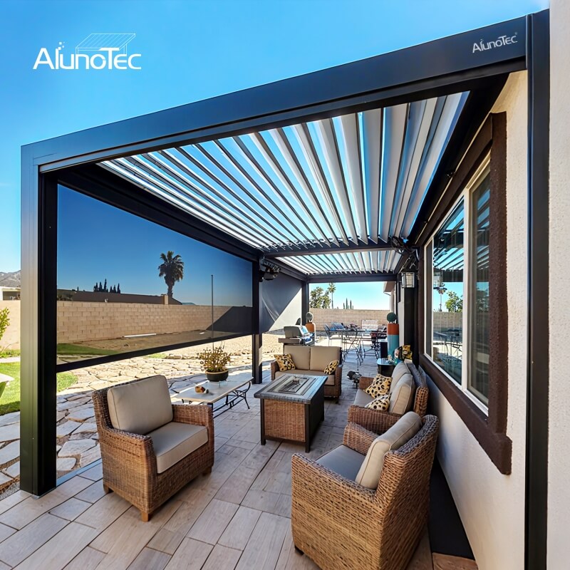 A: No. When the louvers close, they form a waterproof roof; rain is routed through the integrated gutter and hidden downspouts inside the posts. Products are listed with an IP67 waterproof rating for the drive/electrics.